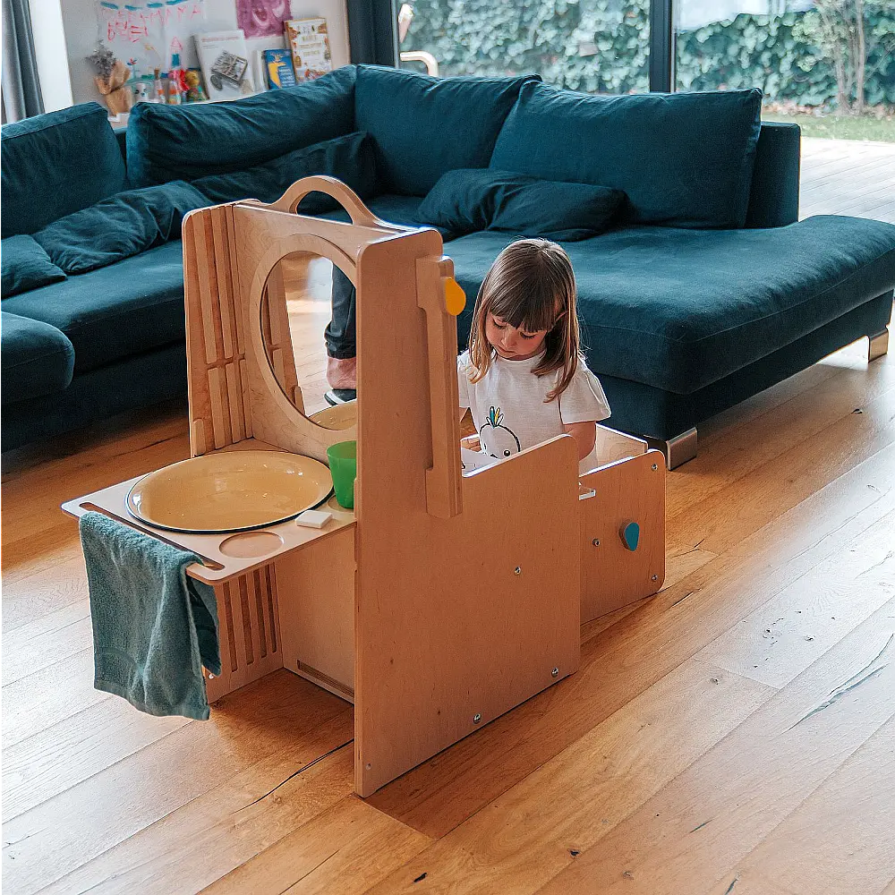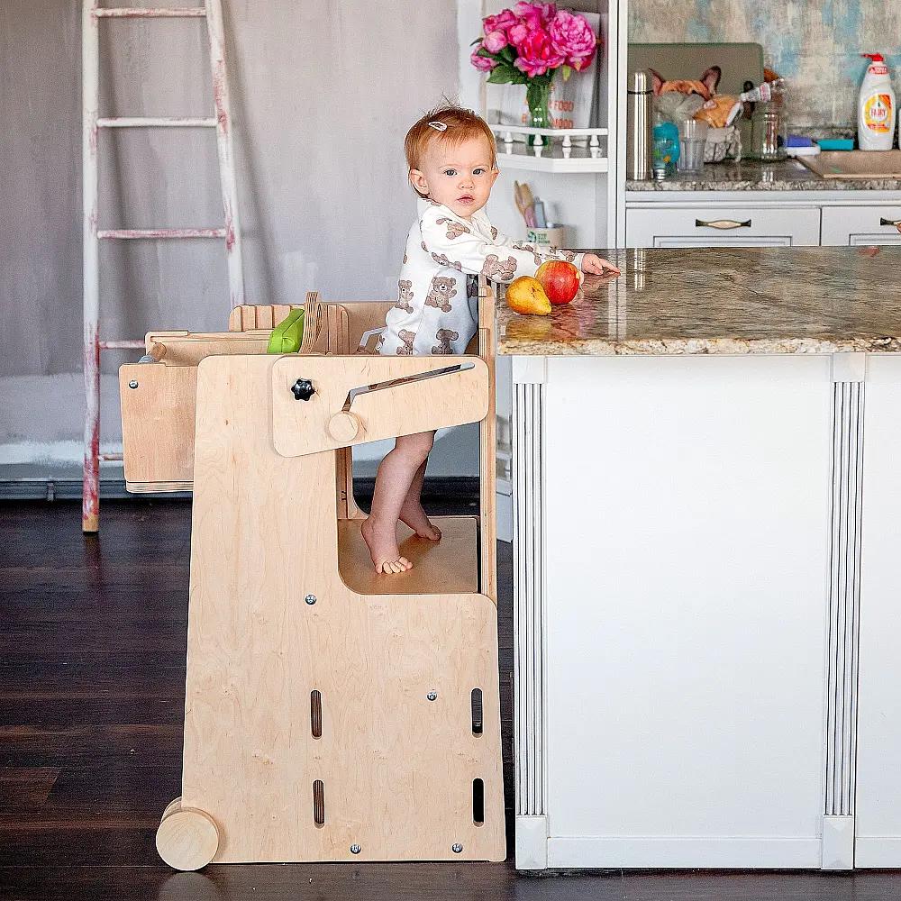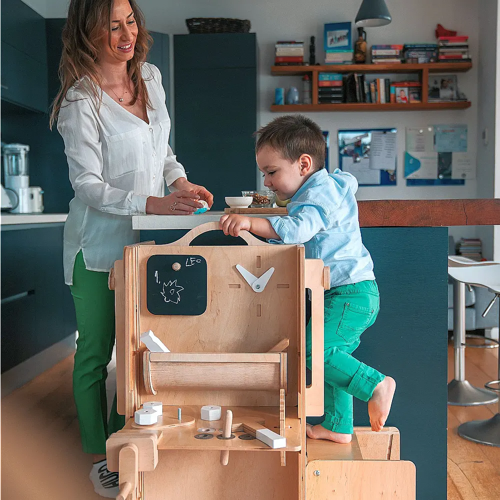 Turnul Montessori: Poți construi un turn fie complet închis, fie deschis, în care copilul urcă singur, din lateral sau chiar din spate. Astfel, poți adapta turnul la orice format de bucătărie și la orice nivel de abilități al copilu