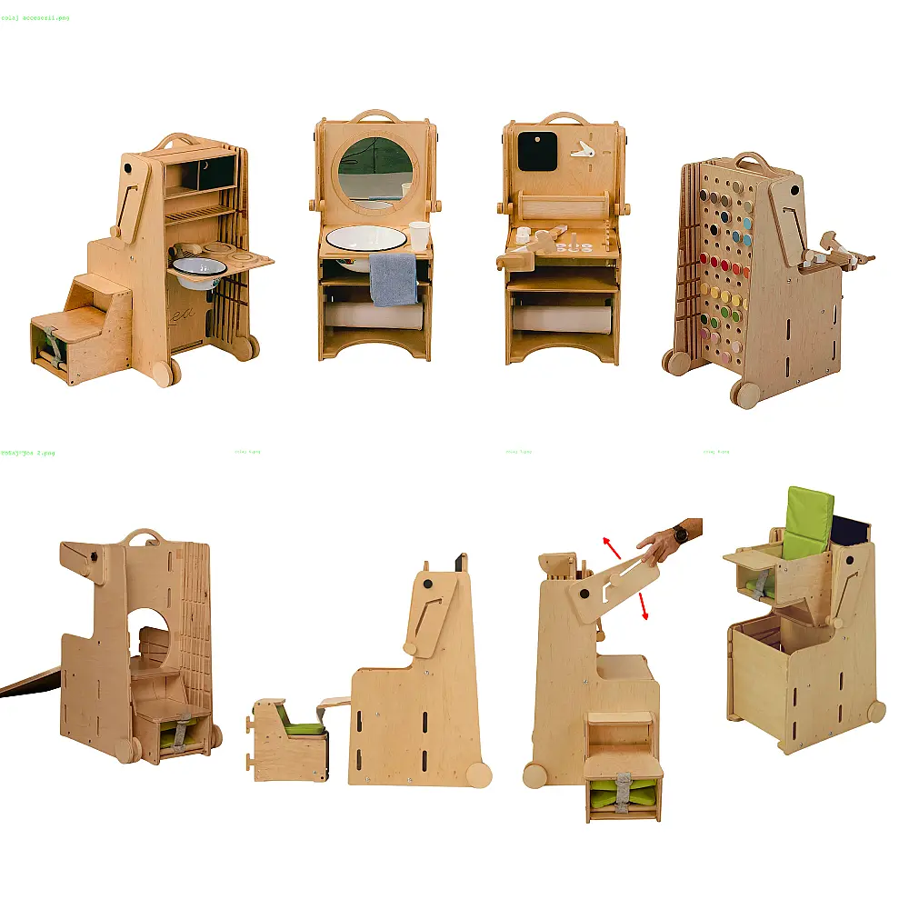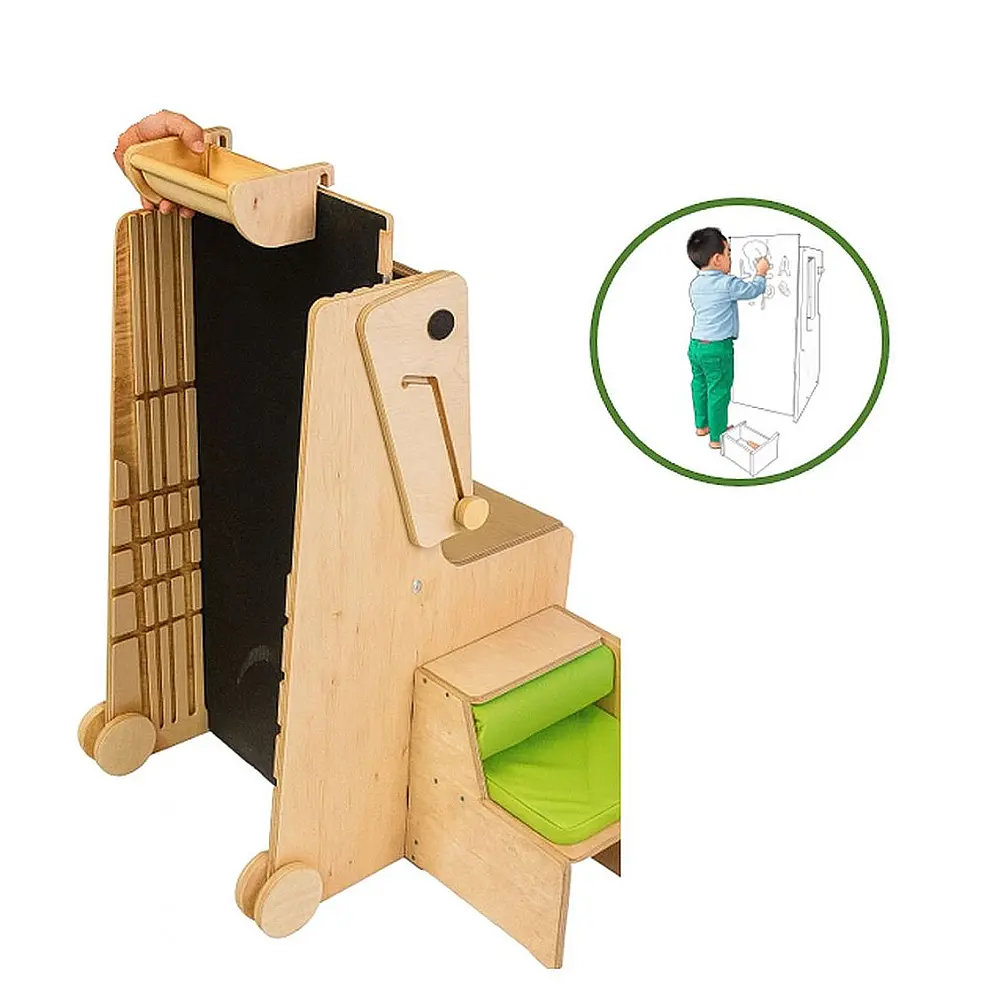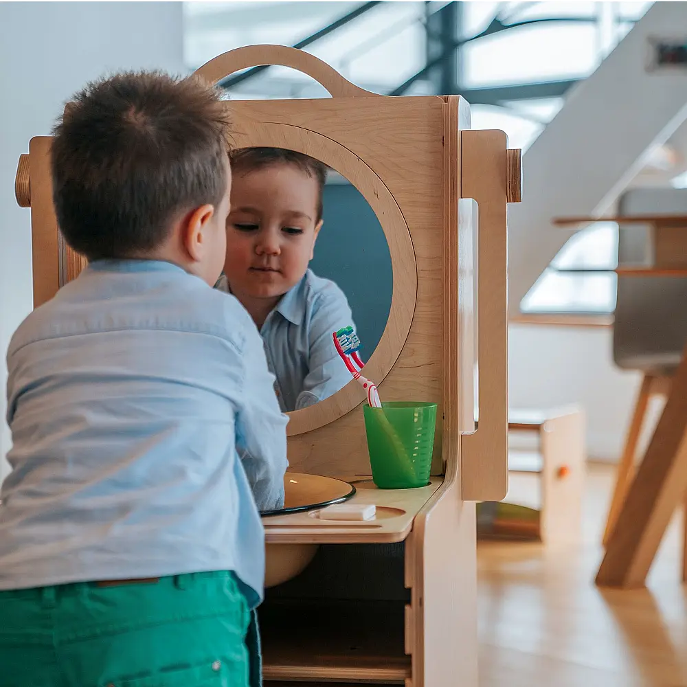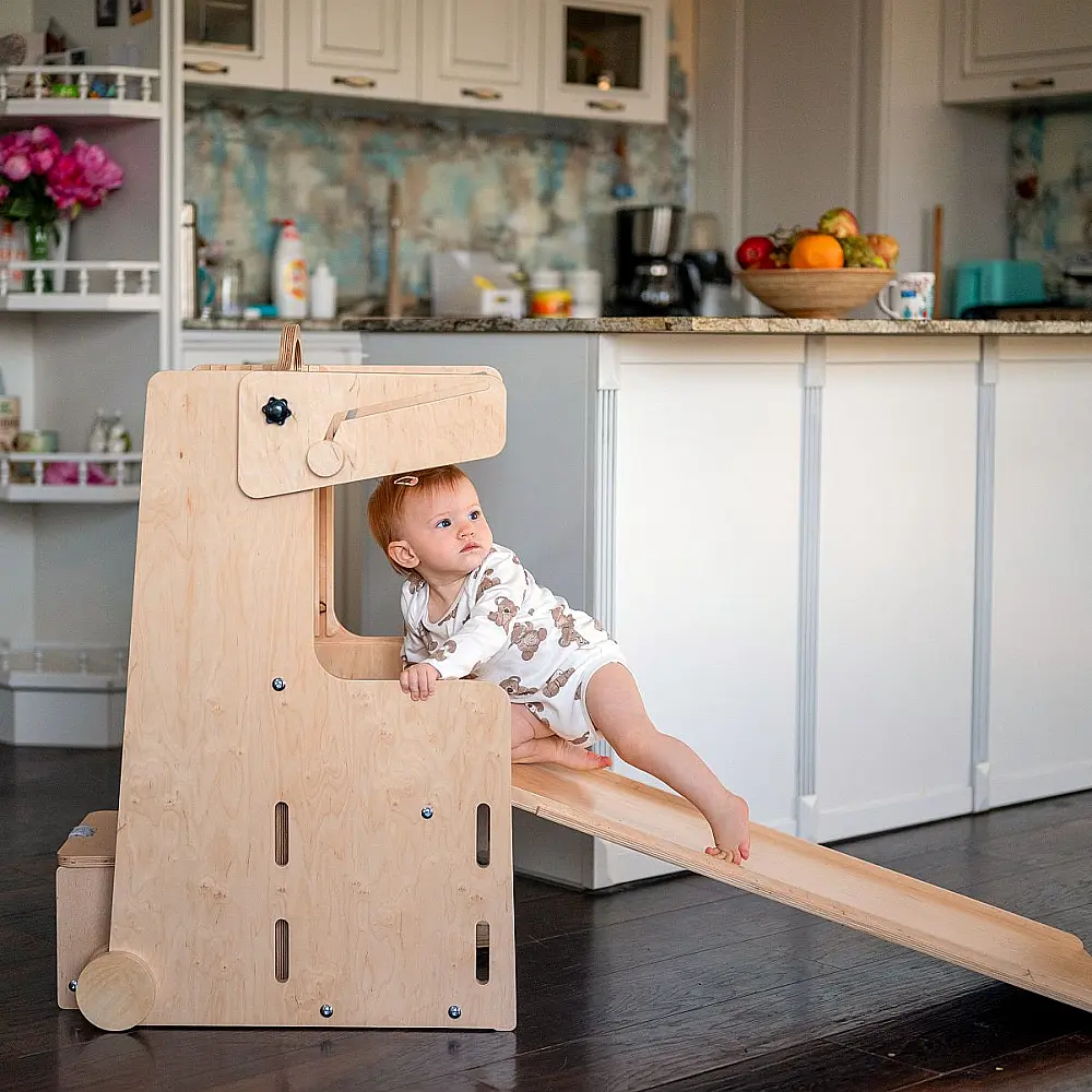 Turnul Montessori: Poți construi un turn fie complet închis, fie deschis, în care copilul urcă singur, din lateral sau chiar din spate. Astfel, poți adapta turnul la orice format de bucătărie și la orice nivel de abilități al copilu