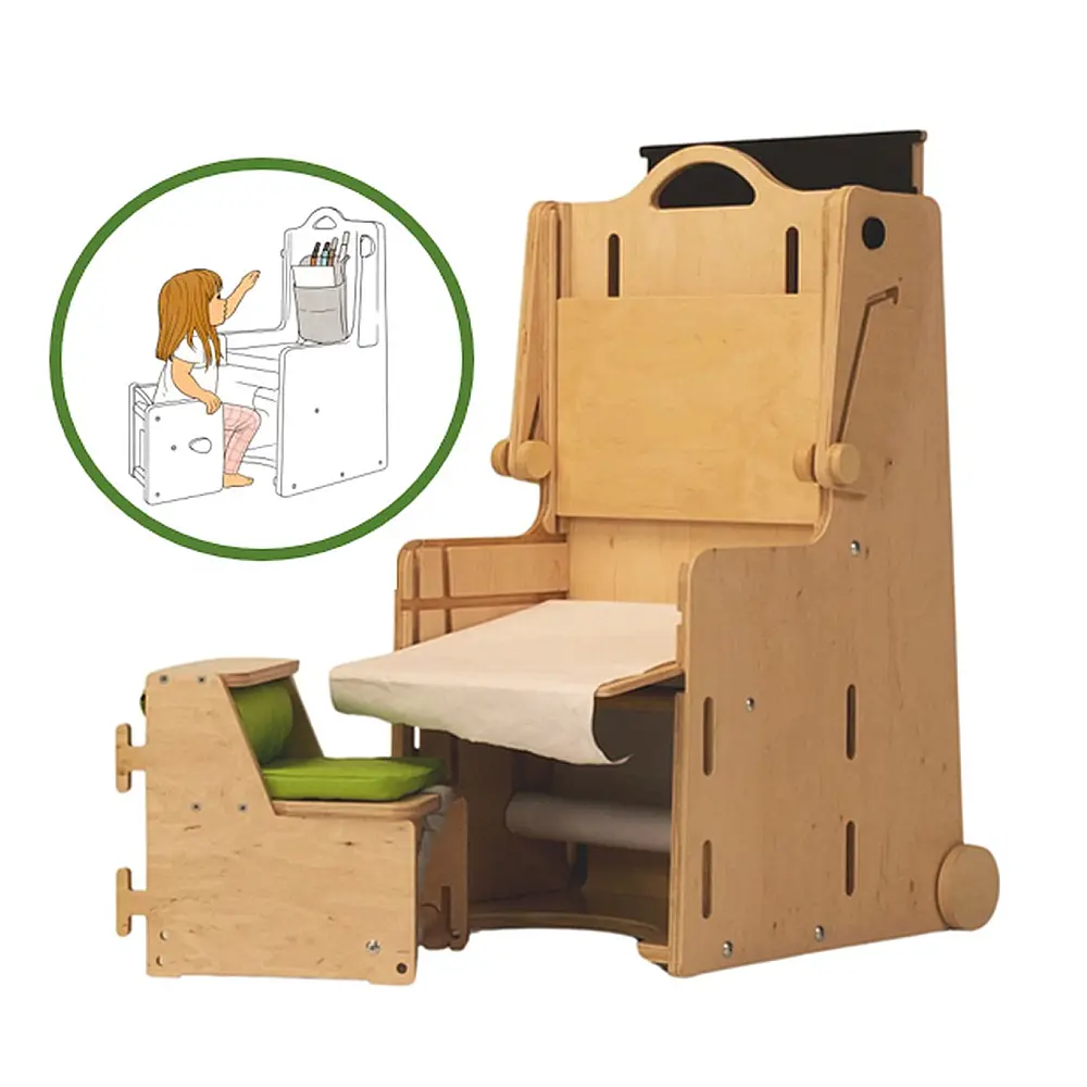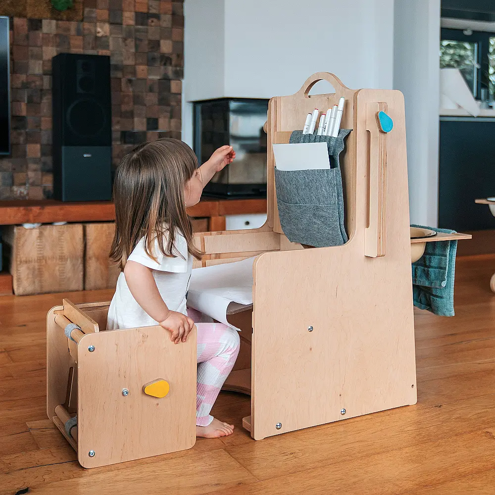 Masă și scaun: Transformă Stația de joacă într-un mini-birou în câteva secunde! Treapta pe care o foloseai la turn este acum scaun iar masa este reglabilă pe trei nivele, sau poate fi poziționată chiar oblic. Sub masă ai instalată o rolă de hârtie pentru desen.