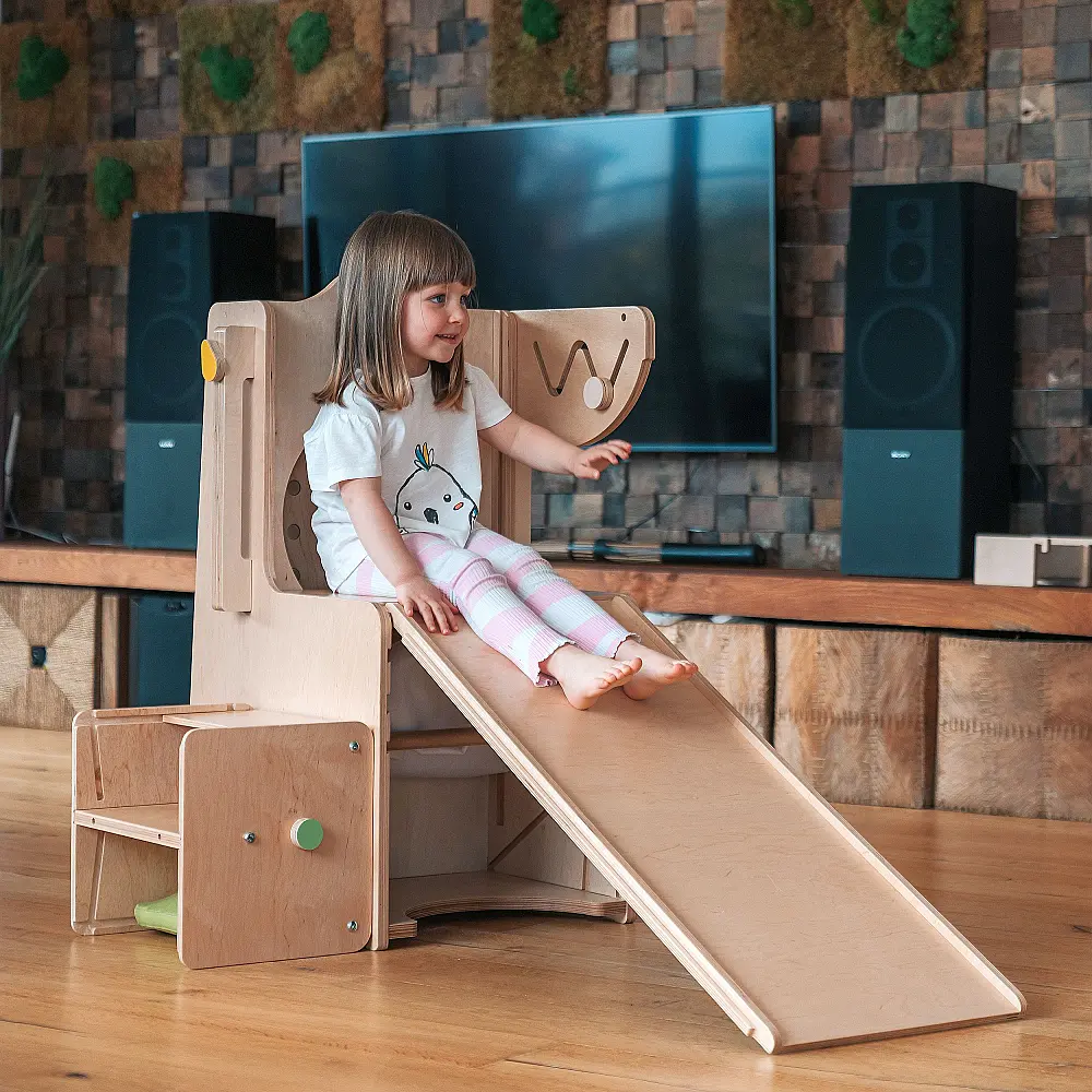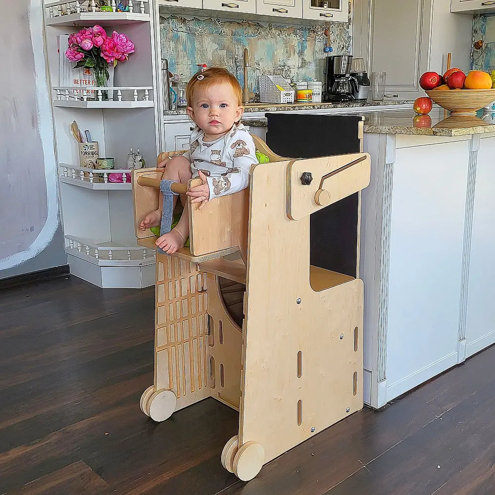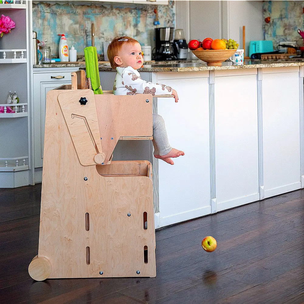 Scaun inalt cu măsută de hrănire: Întoarce treapta turnului cu susul în jos și ea devine un scaun înalt pentru bebe, cu măsuță detașabilă pentru hrănire . Ai și o pernă inclusă, pentru confort!