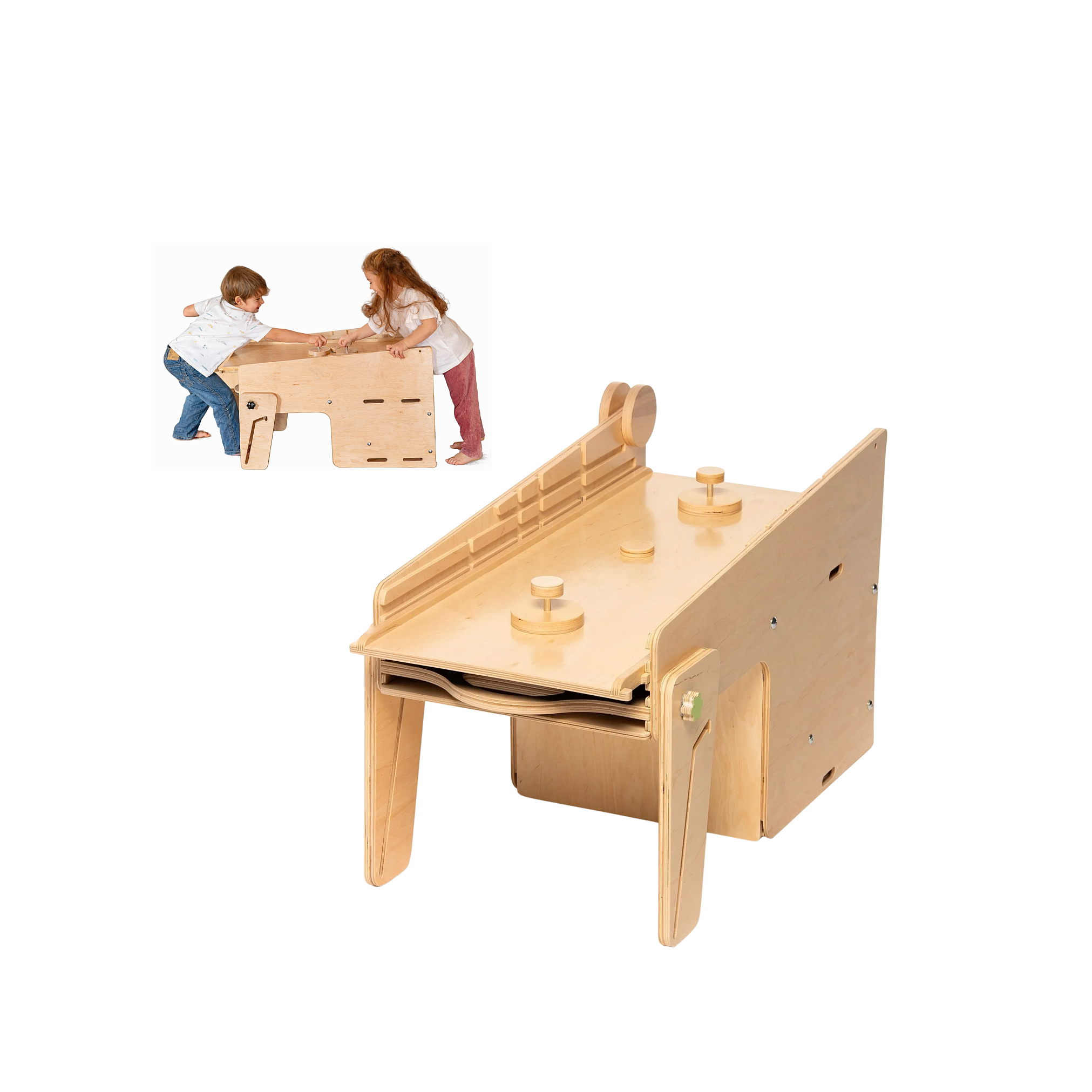 Placa de tobogan montată în poziție orizontală devine o masă de joc unde poți participa și tu. Folosește roțile detașabile pentru un joc de hockey, sau orice altceva, la care poți participa și tu. Timpul petrecut cu copilul este întotdeauna timp câștigat.
