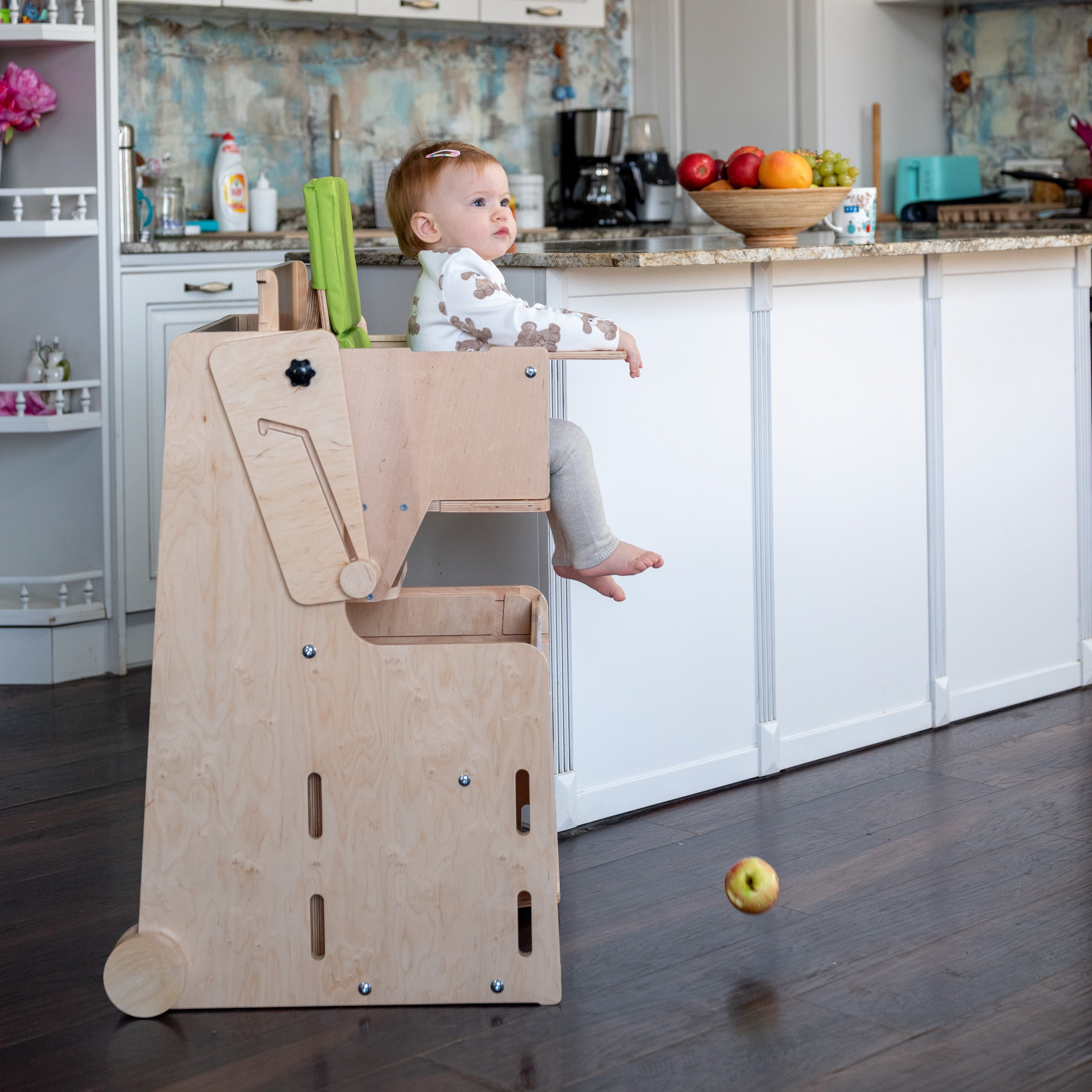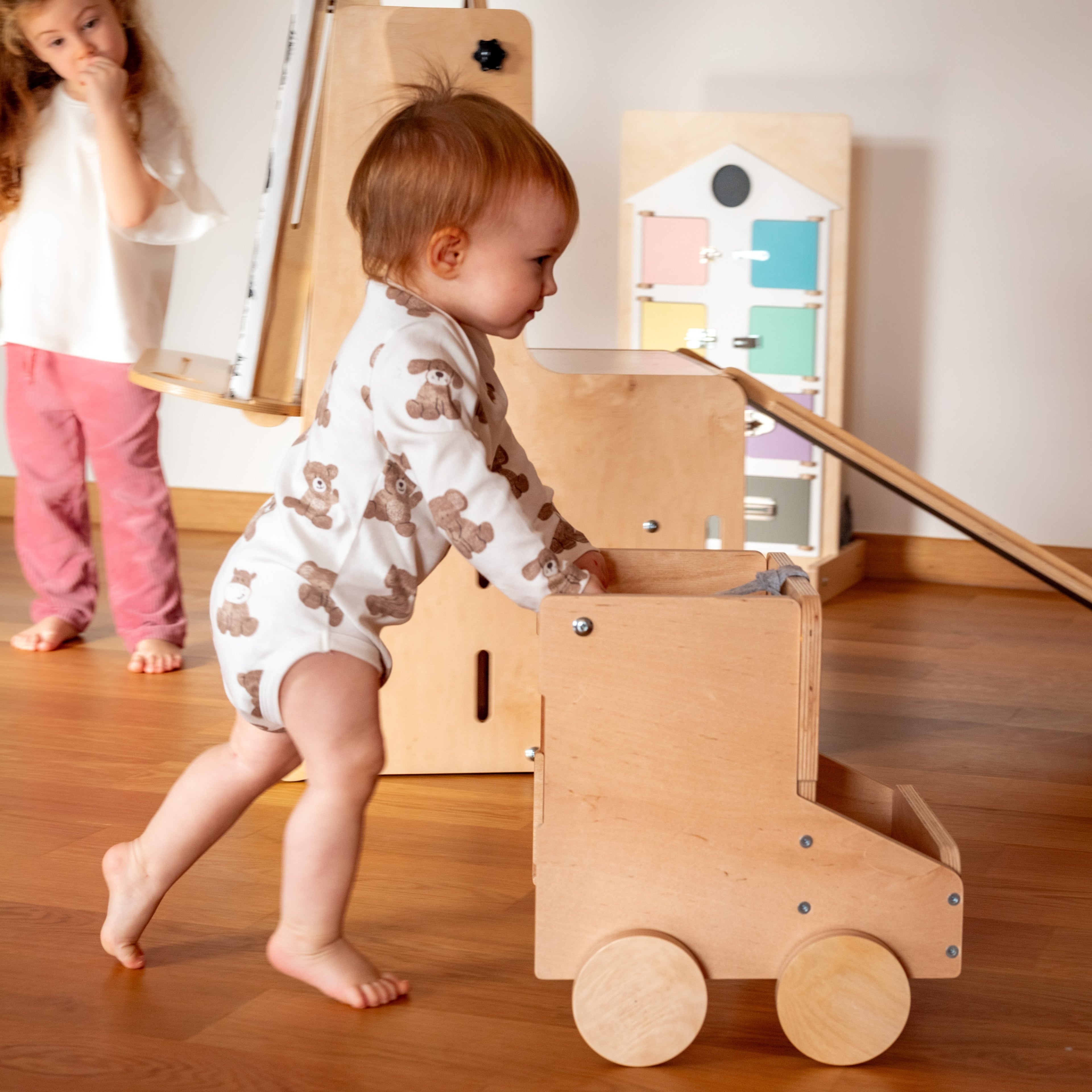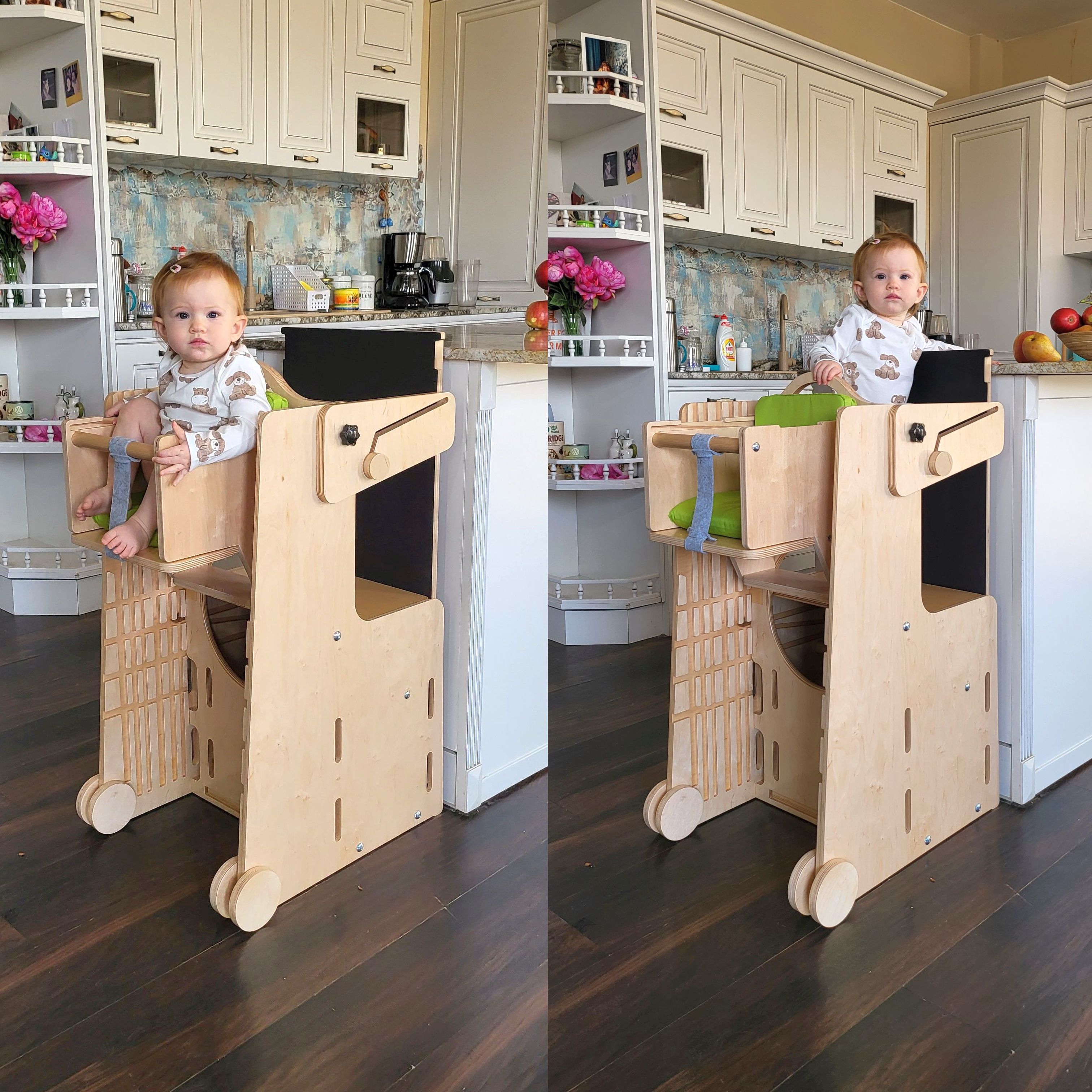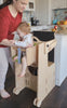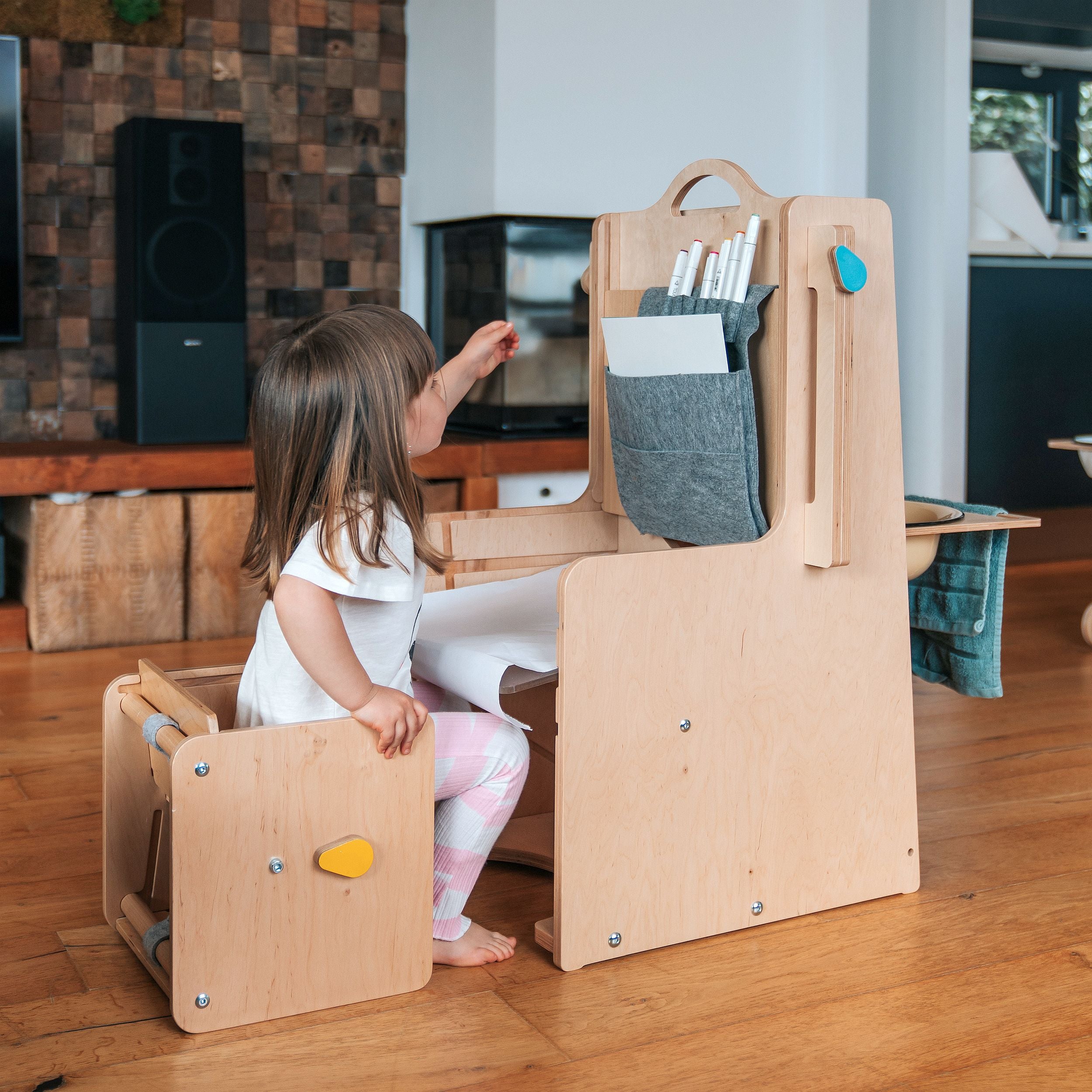Când cumperi Stația de Joacă, primești tot ce ai nevoie pentru a configura cele mai importante 7 funcții: turn Montessori, tobogan, tablă de scris, scaun înalt, înălțător, mini-kart și masă de activități.