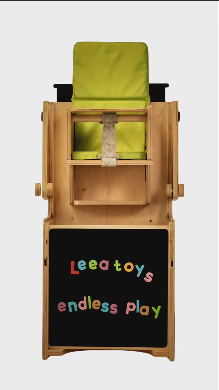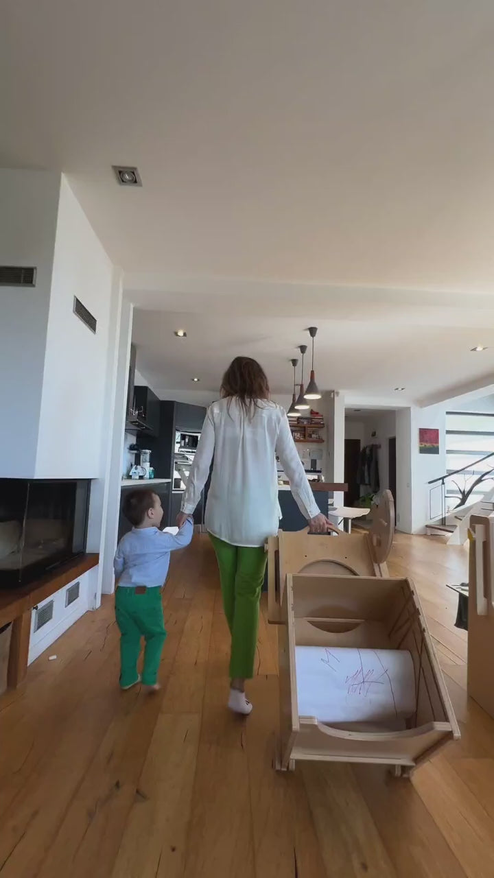 Configurează din treaptă un scaun înalt cu spătar, pernă și măsuță detașabilă, în secunde. Acum ai spatele Stației liber, poți pune acolo panouri cu activități sau o oglindă Montessori cu bară.