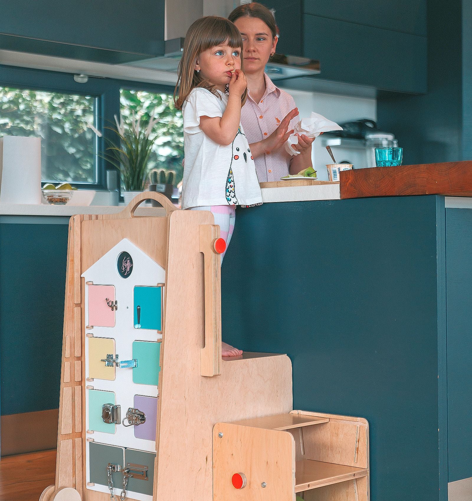 – la 8–18 luni: turn închis + booster sau turn închis + oglindă Montessori
